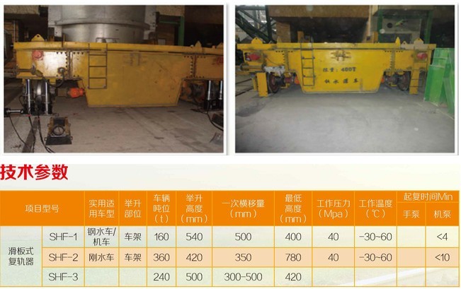 SHF型滑板式復軌器是一種垂直頂升水平橫移的新型復軌具,淘汰了同類產品的橫移梁,橫移車和舉升液壓缸計,采用獨特的懸掛橫移梁、懸掛液壓缸和滑板式缸座設計,降低了復軌器最低高度。加長了液缸,增加了頂升高度,是復軌器一次便可達到頂升高度。因此比同類復軌器快了幾倍,由于采用懸掛式缸和懸掛橫移梁使梁上高度低,增加了軌器的安全系數,該復軌器比同類產品,安全、快遞。特別適用于重型機車、車輛的起復救援。