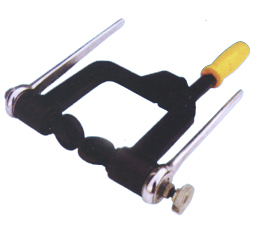 它有一個門形框架,由左支架和右支架通過一套四連桿機構(gòu)鉸鏈而成,鎖緊桿上端裝有手柄,左支架下端的軸套中裝左軸,左軸右端裝有圓盤狀刀片,左軸左端裝有棘輪扳手,右支架下端的軸套中裝有右軸,右軸上套裝一個壓緊彈簧,右軸左端裝有圓盤刀片,右軸右端裝有棘輪扳手。